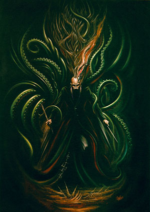 work. People tend to focus much more on the monstrous elements, especially Cthulhu, which is one of the few Lovecraftian deities with a defined appearance. There’s something very attractive about the phrase “cosmic horror” although it’s a sub-genre which can be difficult to illustrate. This creates challenges you don’t get with other forms of horror. How do you represent para-dimensional gods or alien creatures and the millennial time-spans they inhabit? How do you represent the